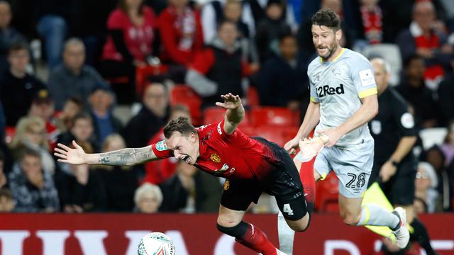 Pemain Manchester United, Phil Jones terjatuh saat berebut bola dengan pemain Derby County, David Nugent di Piala Liga Inggris di Old Trafford, Manchester, Inggris, Selasa (25/9). (Martin Rickett/PA via AP)